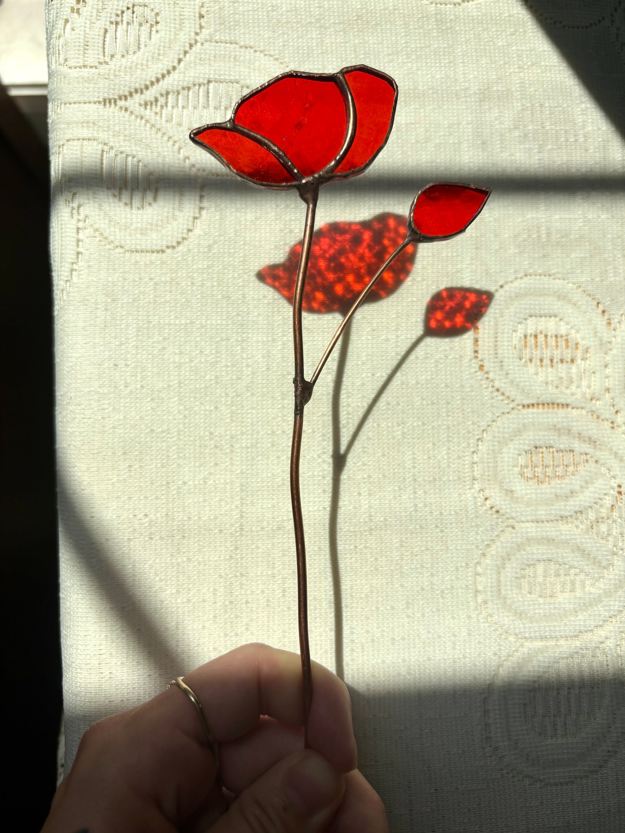 The copper wire and copper finish curve around the petals the way real poppies twist and wind, a little wild but still intentional. When you hold it up to the sun, the whole thing lights up with this deep, calm warmth. It gives you a moment of quiet without asking for anything in return.